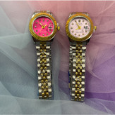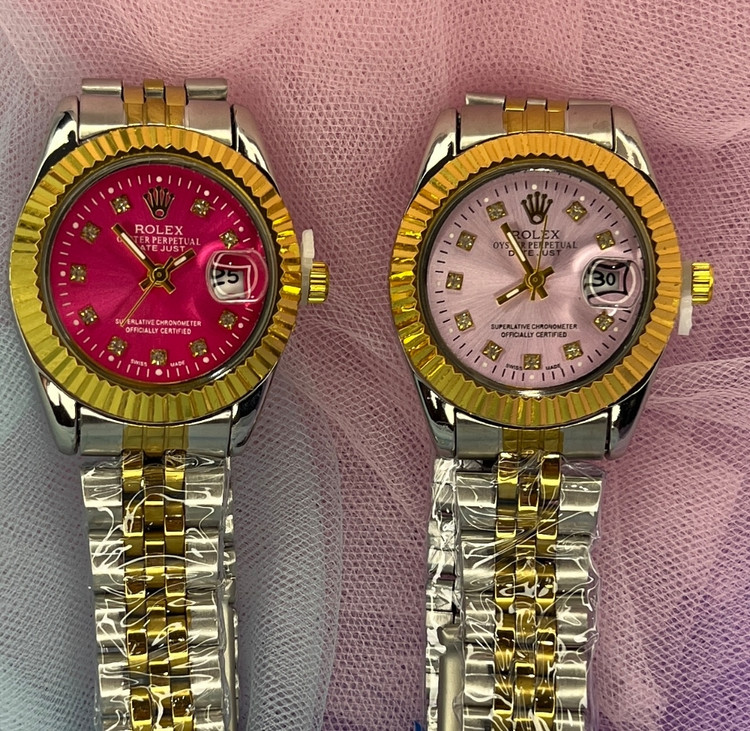 ساعت زنانه رولکس دوموتوره بند دورنگ صفحه گرد رنگی